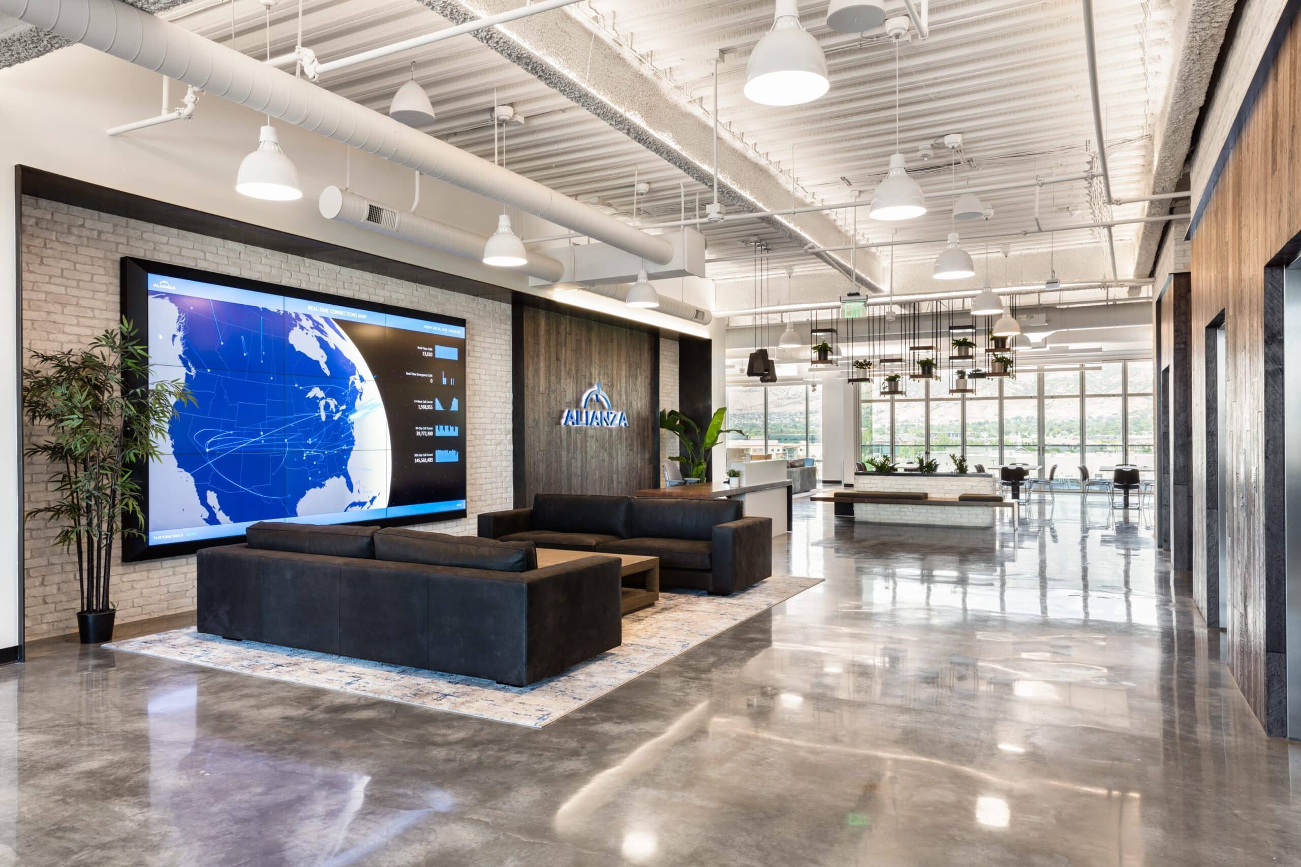 Alianza’s goal was to create a space where clients immediately knew Alianza’s vision and purpose when they walked in. In addition, they wanted to highlight their technology and ability to “connect people” by showcasing a sizeable full-height LCD wall with a live-view screen highlighting the regions where Alianza does business. Finally, the space’s overall design is intended to create an industrial but homeful feel. This was accomplished by using natural soft materials and textures such as rough-sawn timber, live plants, and genuine leathers but was contrasted by solid & more permanent feeling materials such as brick, steel, and exposed concrete.